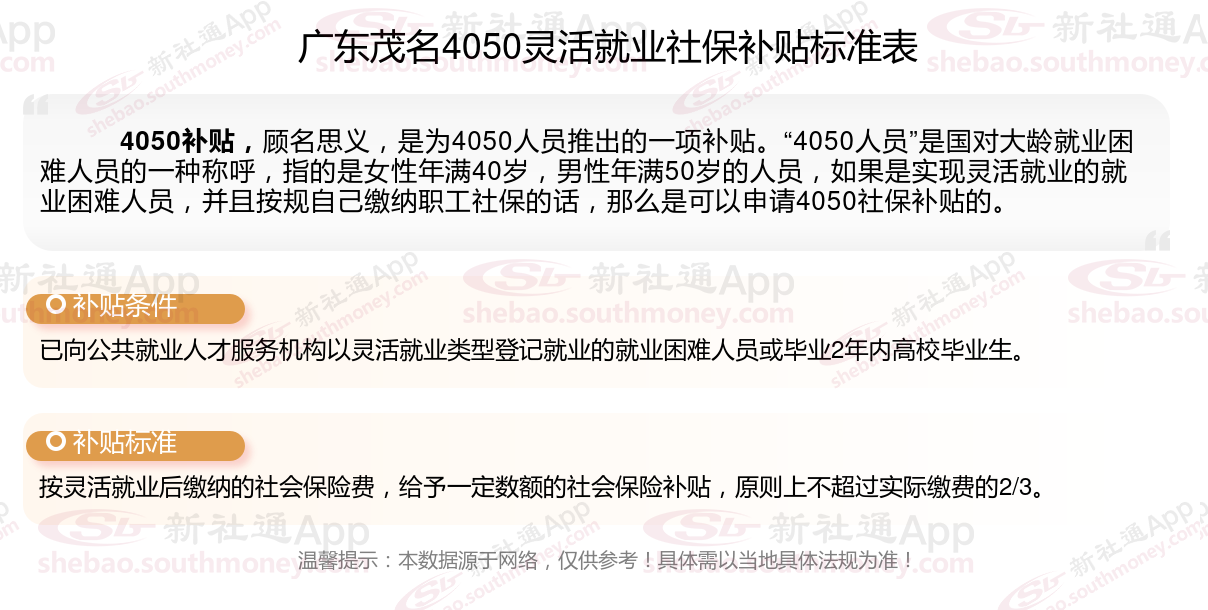 二、2023-2024年广东茂名4050社保补贴标准,最新领取条件来了