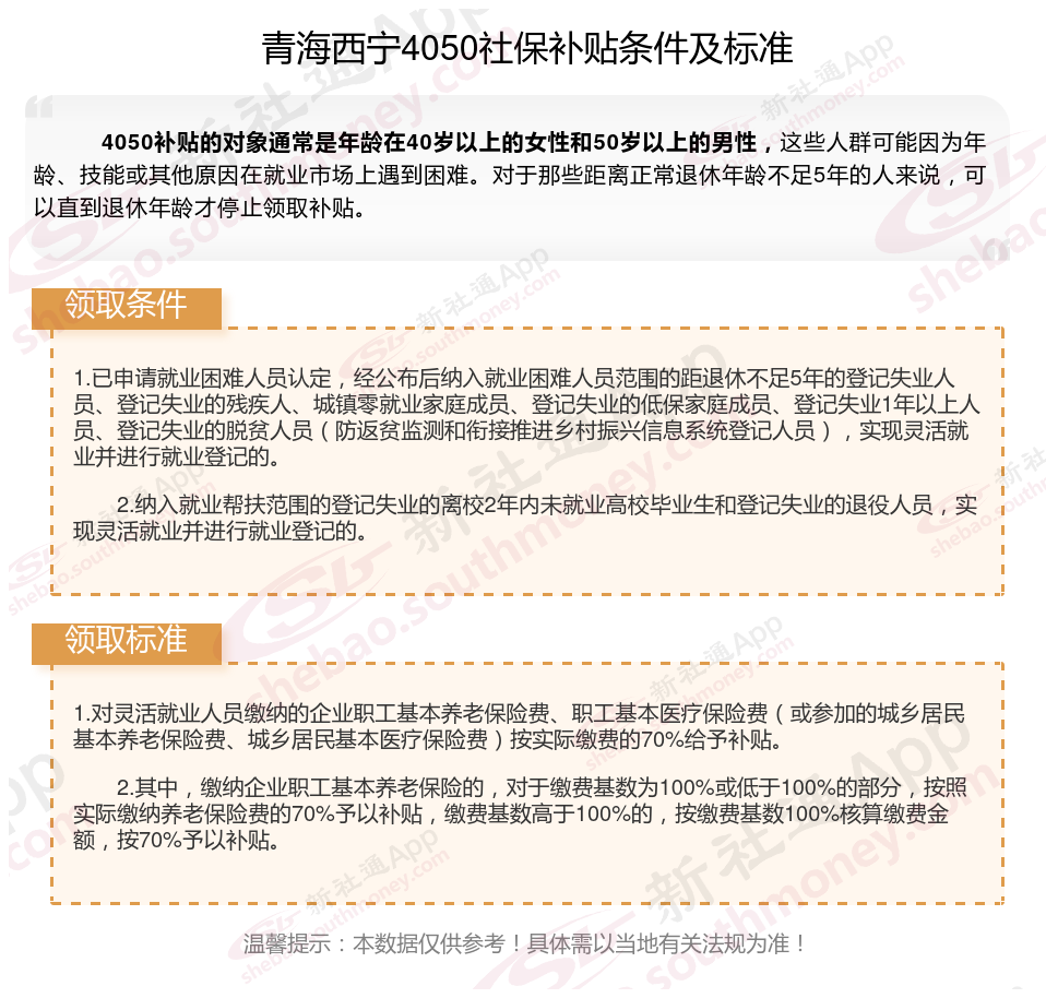 一、2023-2024年青海西宁4050社保补贴标准及条件