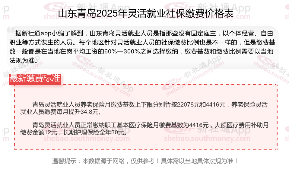 随着经济社会的不断发展,灵活就业群体不断地日益壮大,其社保缴费问题也愈发受到关注。那么2025年山东青岛灵活就业人员社保交多少钱,你了解2025年山东青岛灵活就业人员社保缴费基数及比例吗,接下来随新社通APP小编一起来看看。
