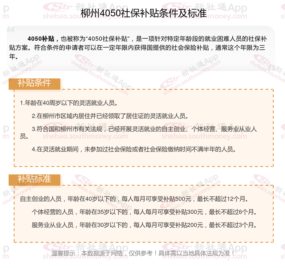 “4050人员”是国对大龄就业困难人员的一种称呼,指的是女性年满40岁,男性年满50岁的人员,那么柳州4050灵活就业社保补贴标准是多少钱?柳州4050社保补贴条件是什么?接下来随新社通APP小编了解一下最新资讯。