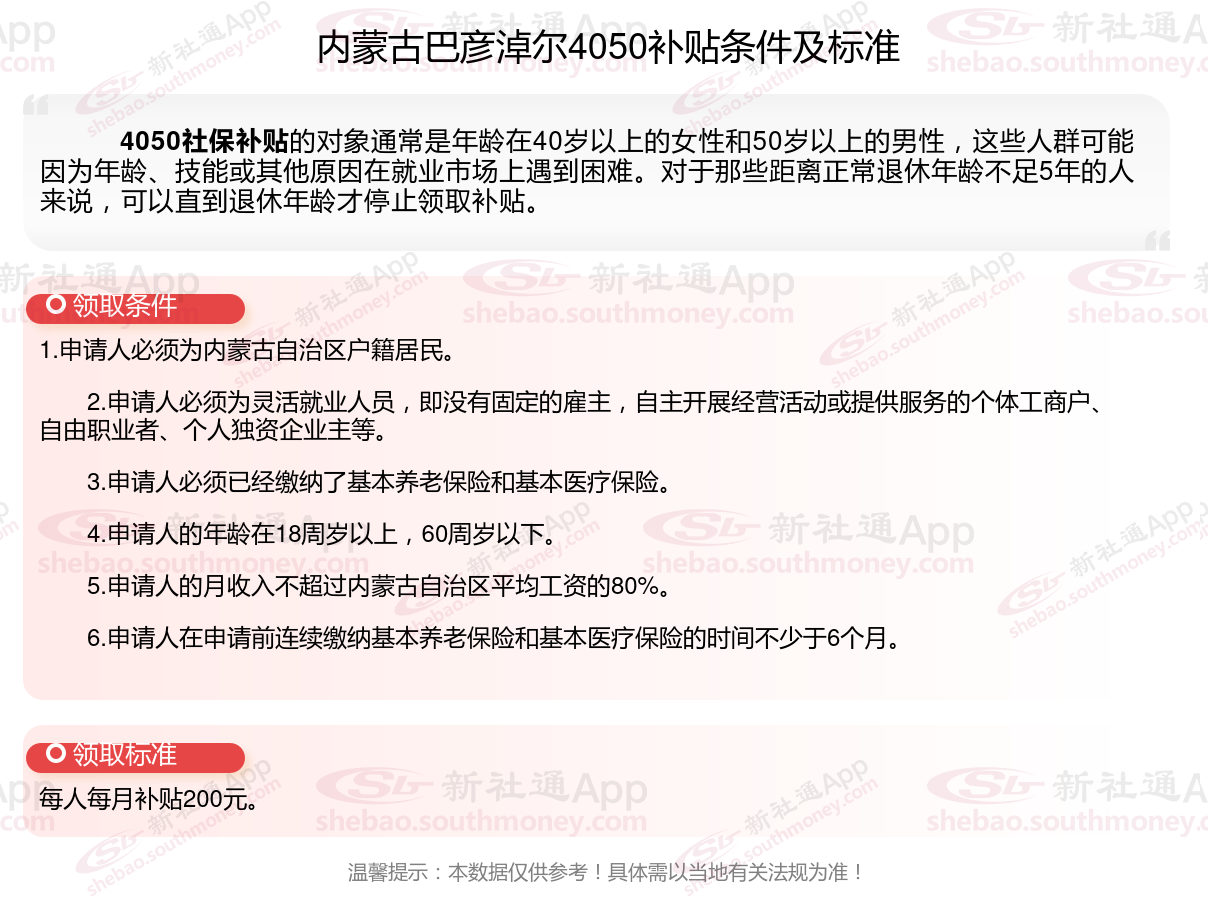 2025内蒙古巴彦淖尔4050补贴主要针对的是年龄在40岁以上的女性和50岁以上的男性,这些人群通常因为年龄较大而面临就业困难。