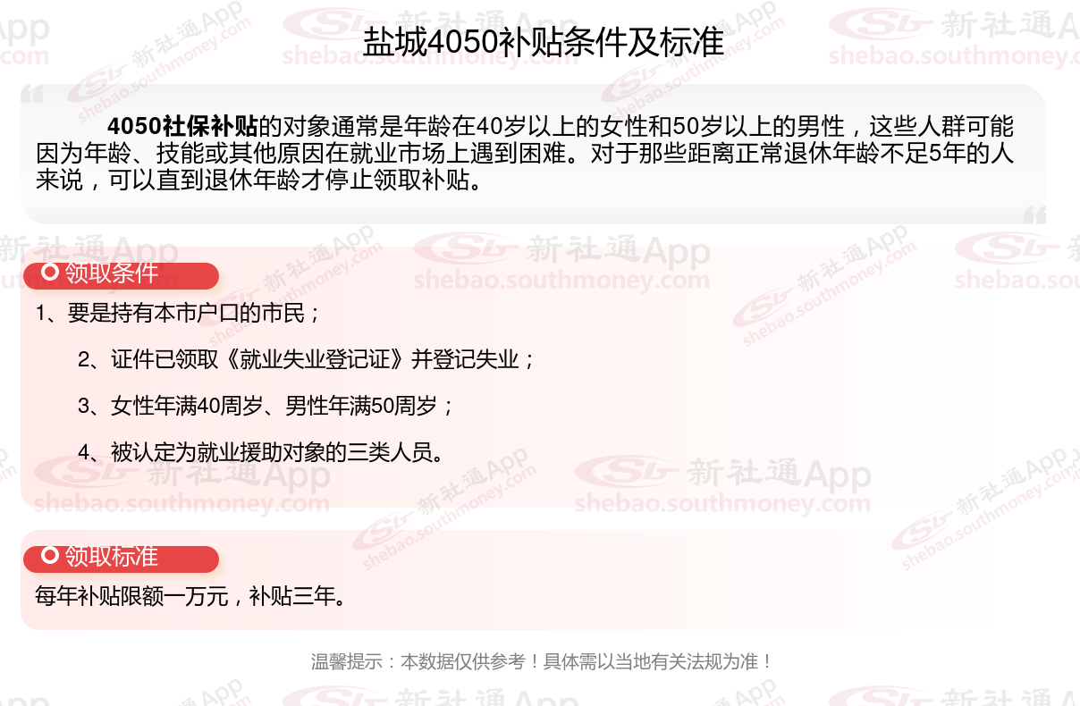 2025盐城4050补贴主要针对的是年龄在40岁以上的女性和50岁以上的男性,这些人群通常因为年龄较大而面临就业困难。