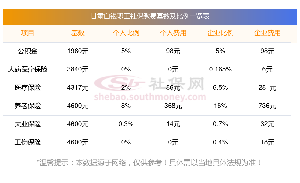 甘肃白银2025年社保缴费个人和公司各承担多少?下表是2025年甘肃白银社保费用明细参考,新社通app-社保缴费查询工具提供的最新数据如下: