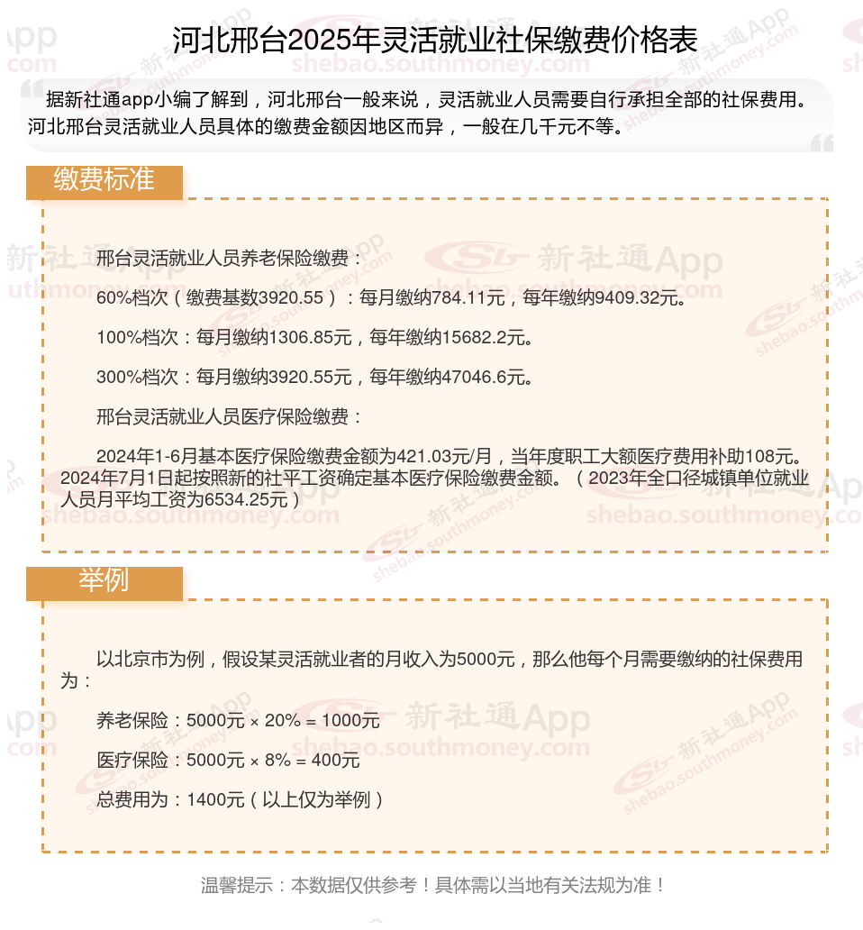 河北邢台灵活就业人员参保月缴费金额是多少?2024-2025年度河北邢台灵活就业人员社保缴费标准是多少?根据新社通app-社保缴费查询工具提供的2025社保缴费标准详情数据: