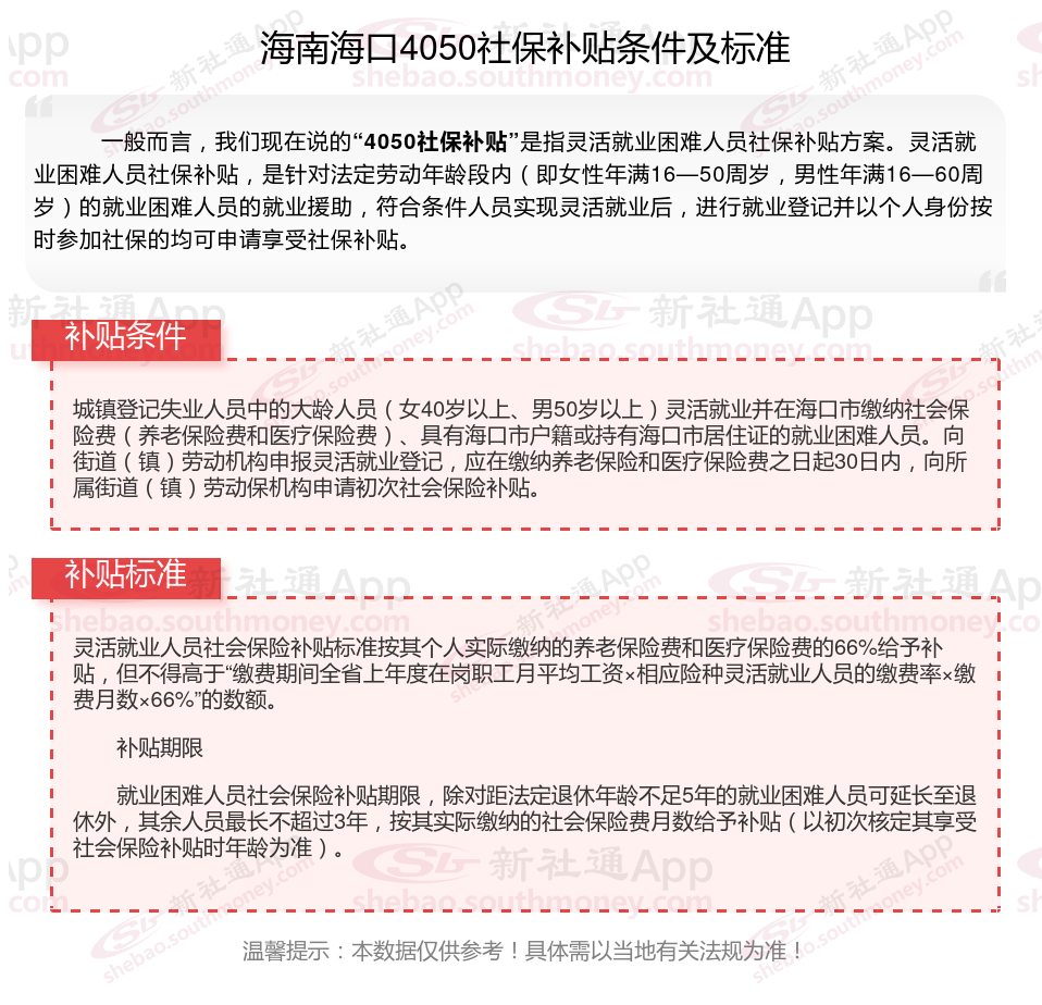 二、2025年海南海口4050社保补贴标准是多少?条件是什么?