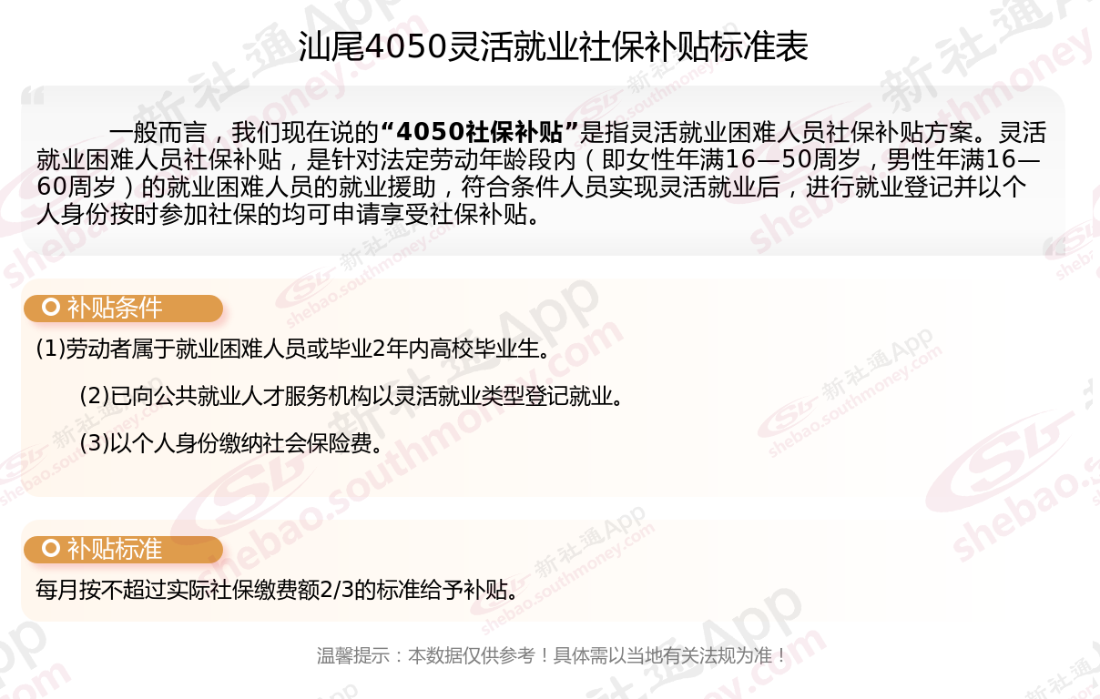 二、2025年汕尾4050社保补贴标准是多少?条件是什么?
