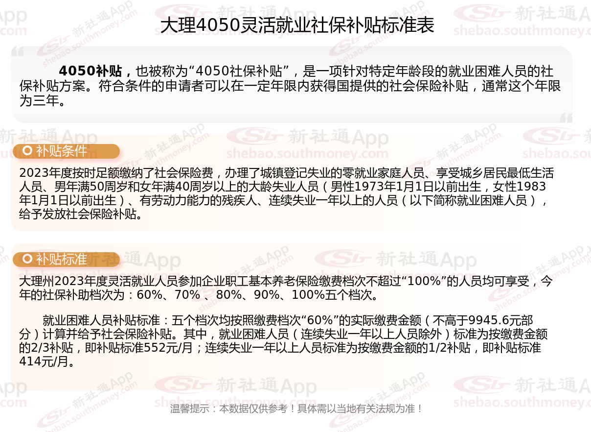 “4050人员”是国对大龄就业困难人员的一种称呼,指的是女性年满40岁,男性年满50岁的人员,那么大理4050灵活就业社保补贴标准是多少钱?大理4050社保补贴条件是什么?接下来随新社通APP小编了解一下最新资讯。
