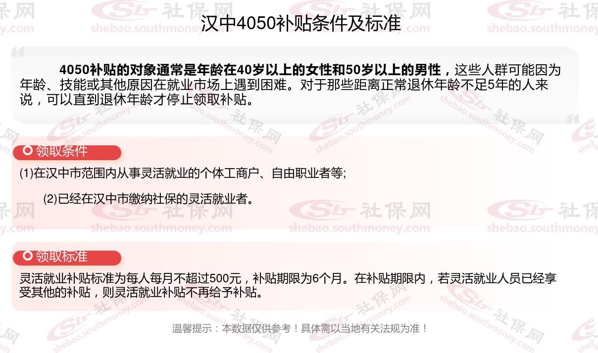 2024汉中灵活就业4050社保补贴是一项面向特定年龄段的就业困难人群的社会保险补贴。