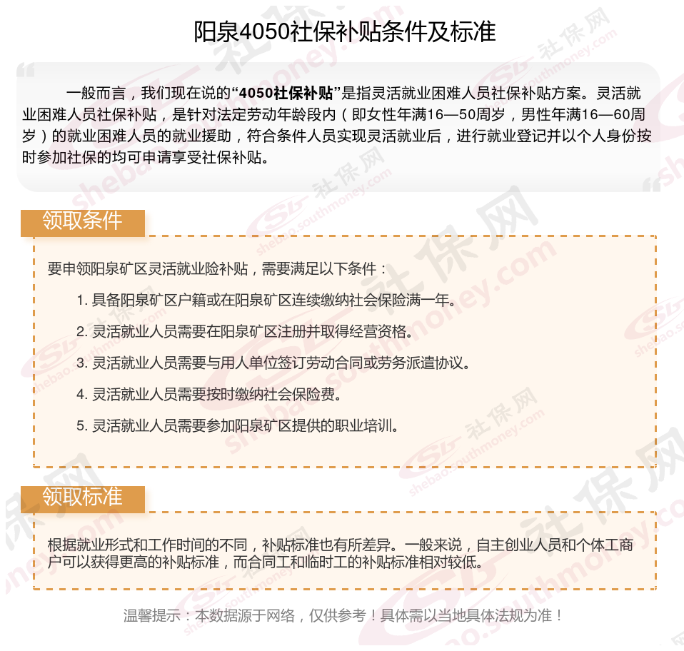 二、阳泉灵活就业4050社保补贴标准及条件是什么