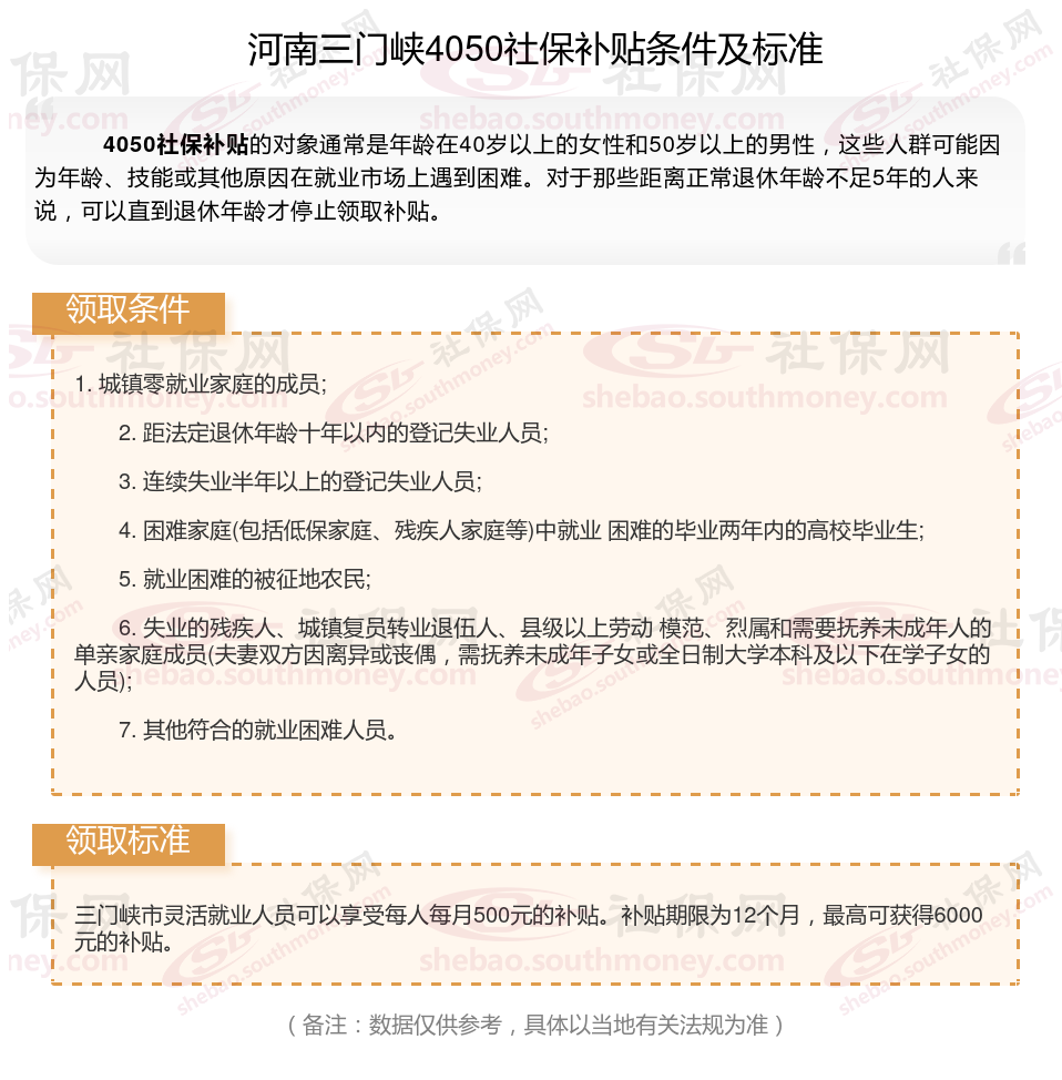 2024河南三门峡4050补贴主要针对的是年龄在40岁以上的女性和50岁以上的男性,这些人群通常因为年龄较大而面临就业困难。