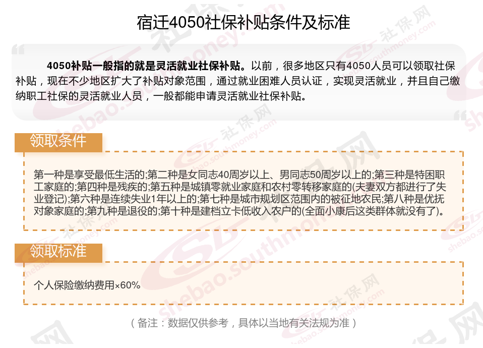 一、2023-2024年宿迁灵活就业4050社保补贴标准和条件是什么
