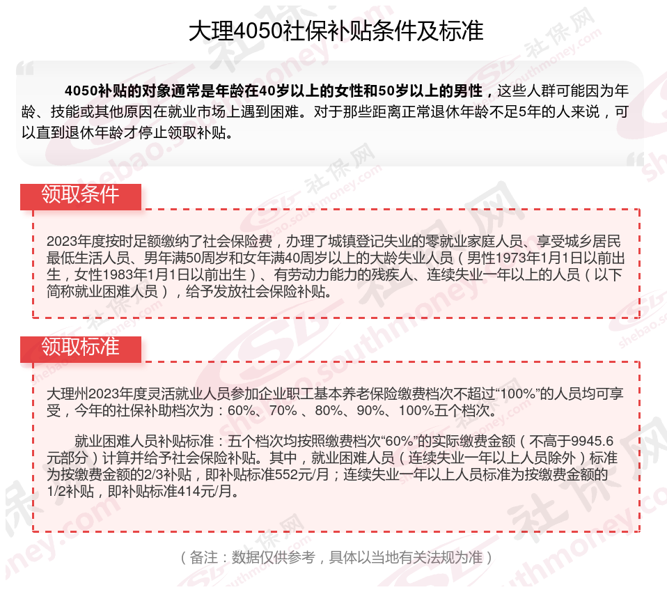 2024大理灵活就业4050社保补贴是一项面向特定年龄段的就业困难人群的社会保险补贴。