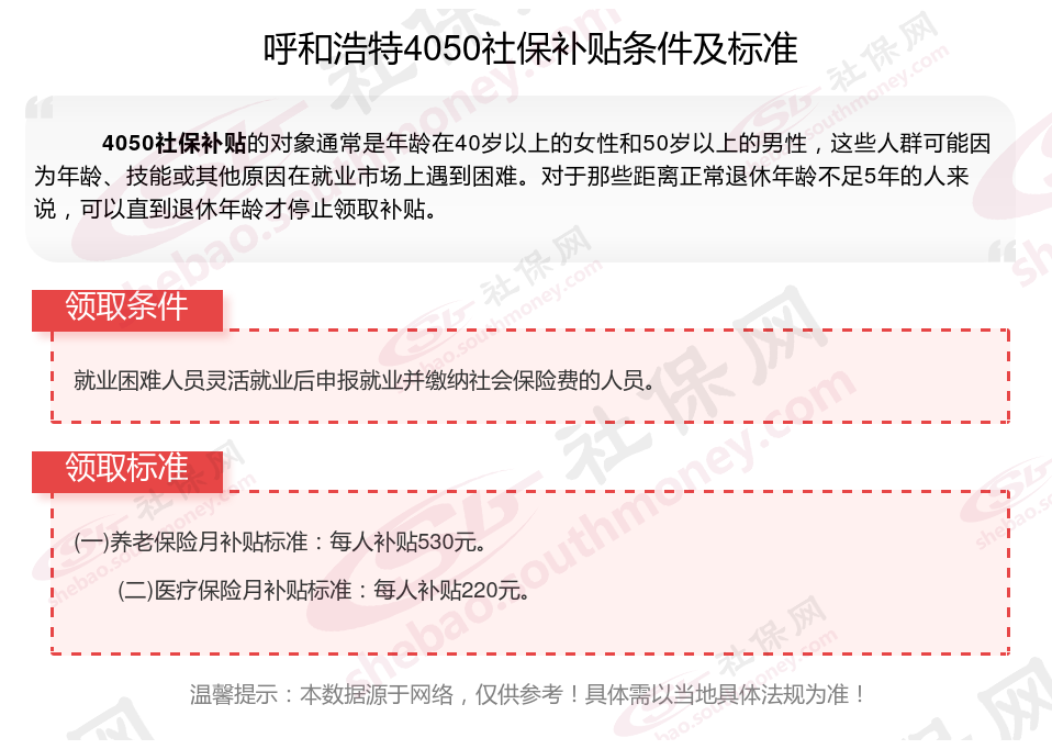二、呼和浩特灵活就业4050社保补贴标准及条件是什么