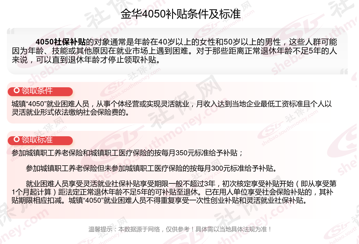 2024金华4050补贴主要针对的是年龄在40岁以上的女性和50岁以上的男性,这些人群通常因为年龄较大而面临就业困难。