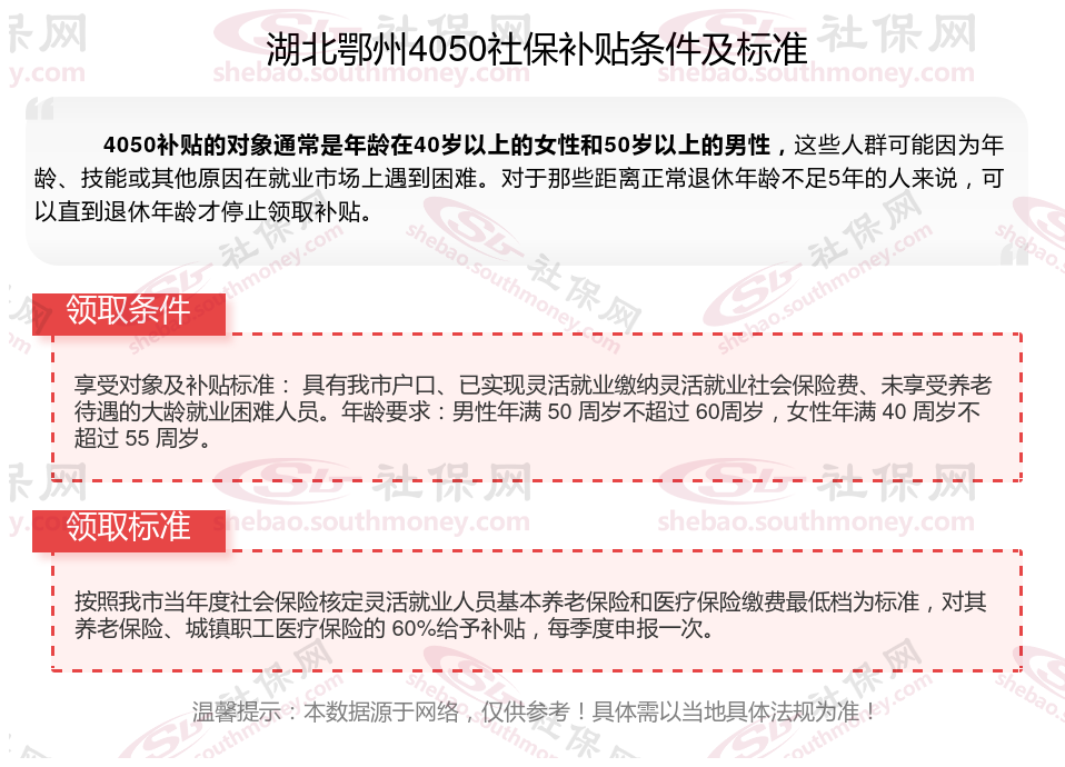 2024湖北鄂州4050补贴主要针对的是年龄在40岁以上的女性和50岁以上的男性,这些人群通常因为年龄较大而面临就业困难。