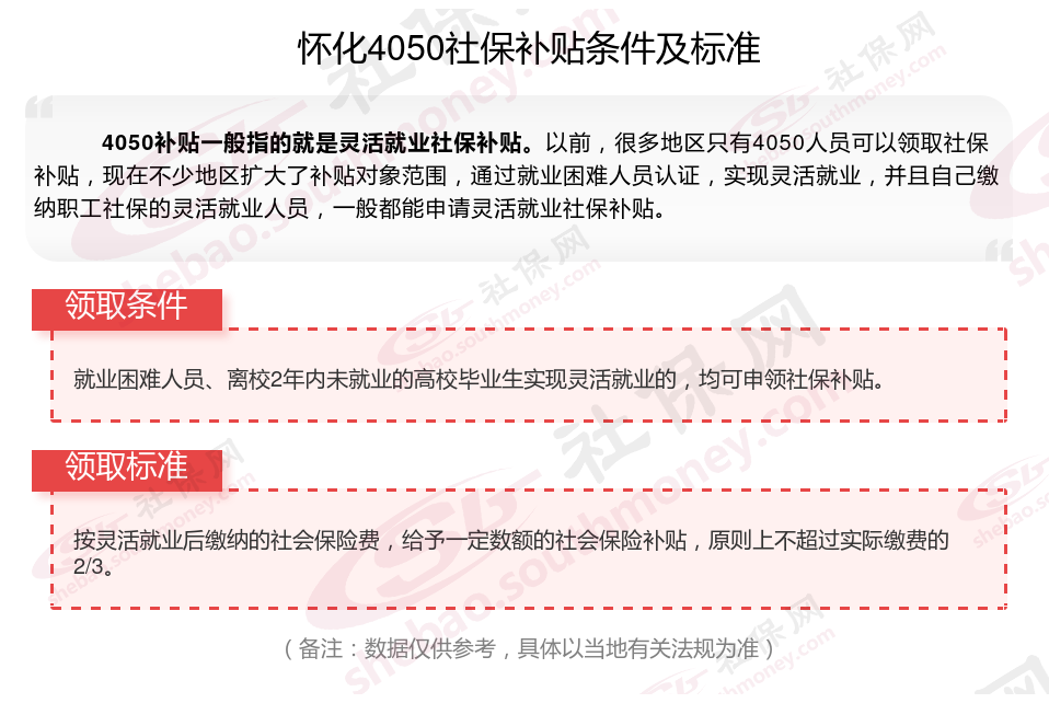 “4050人员”是国对大龄就业困难人员的一种称呼,指的是女性年满40岁,男性年满50岁的人员,那么怀化4050灵活就业社保补贴标准是多少钱?怀化4050社保补贴条件是什么?接下来随社保网小编了解一下最新资讯。