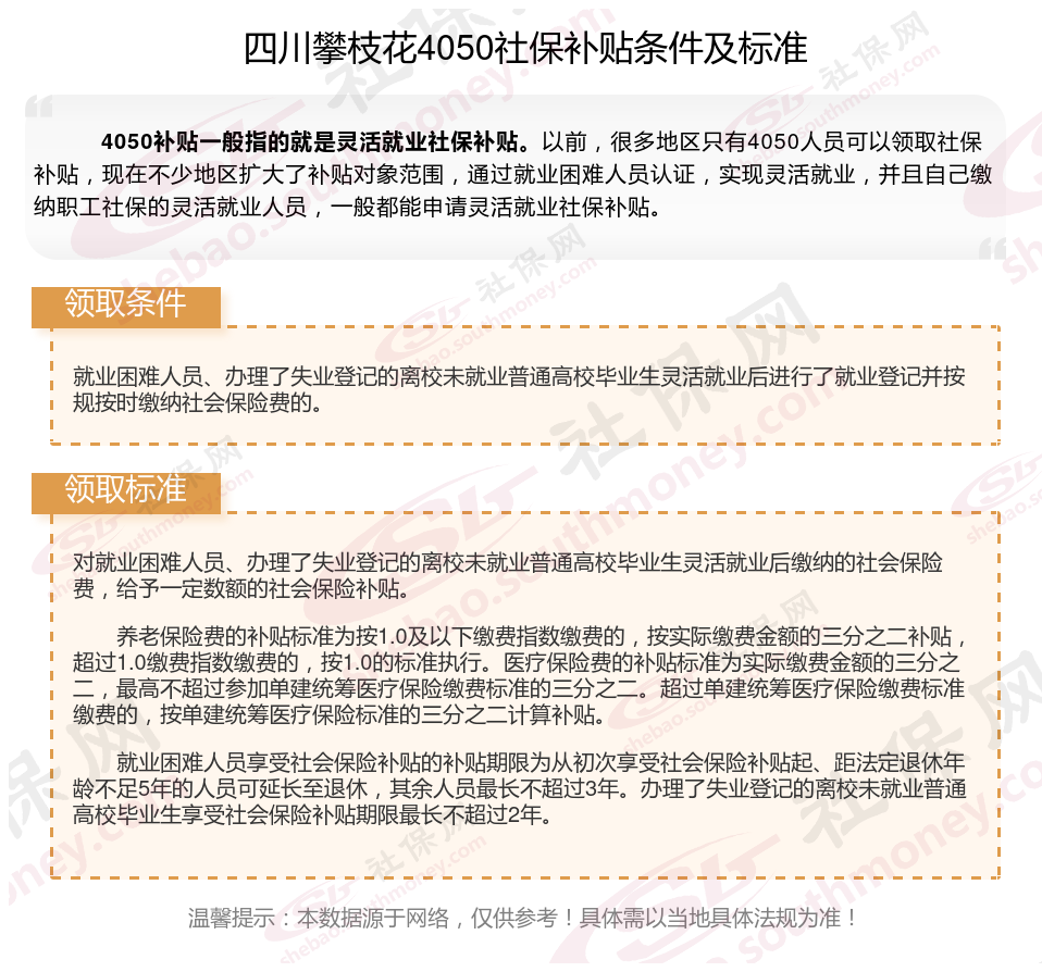 二、四川攀枝花灵活就业4050社保补贴标准及条件是什么