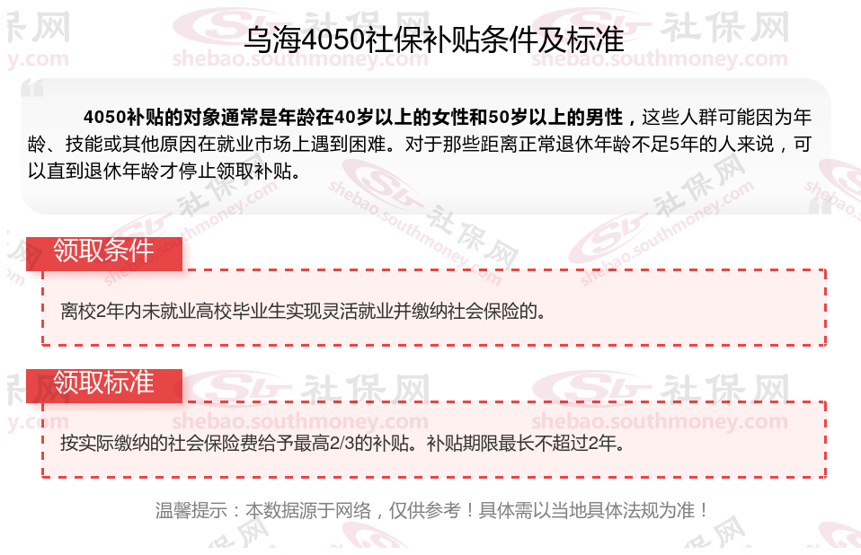 2024乌海4050补贴主要针对的是年龄在40岁以上的女性和50岁以上的男性,这些人群通常因为年龄较大而面临就业困难。