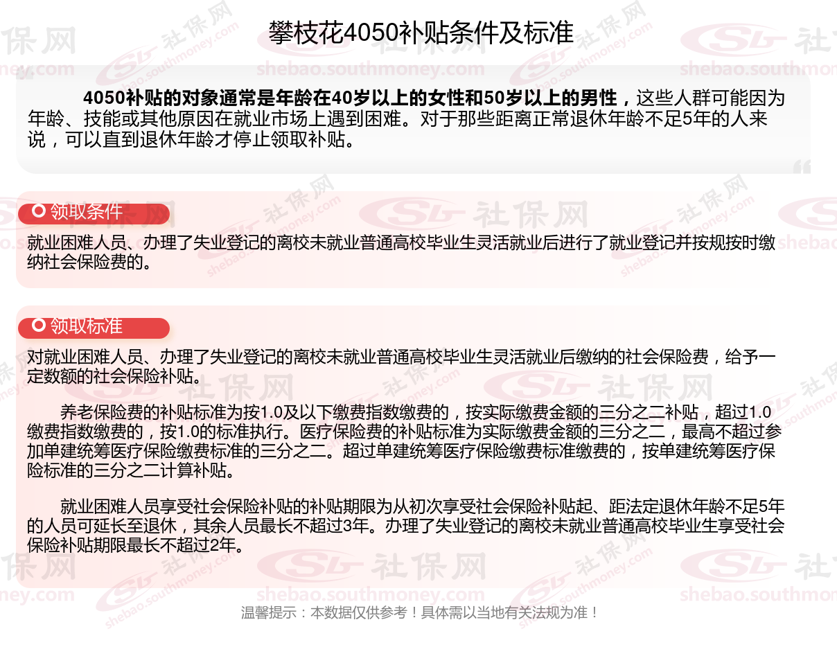 一、攀枝花4050社保补贴标准及条件2023-2024年