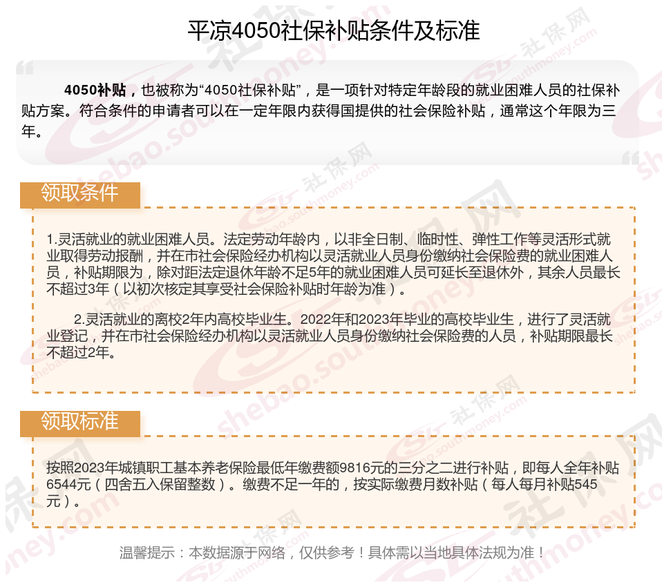 一、平凉4050社保补贴标准及条件2023-2024年