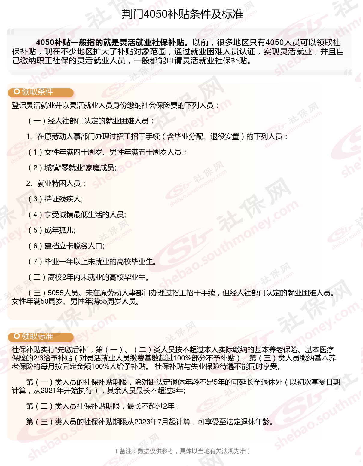 2024荆门灵活就业4050社保补贴是一项面向特定年龄段的就业困难人群的社会保险补贴。