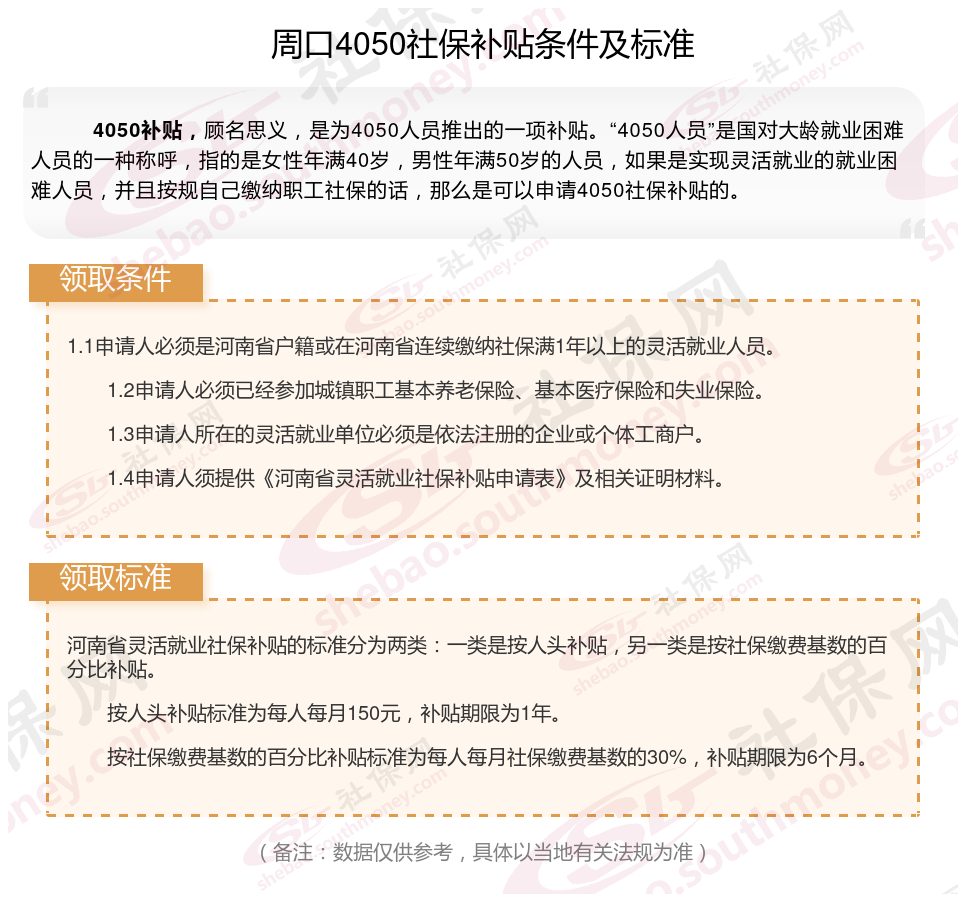 一、周口灵活就业4050社保补贴标准及条件是什么