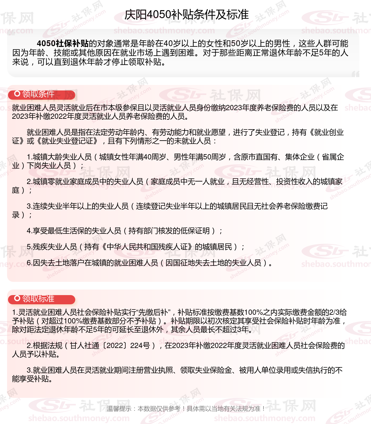 二、庆阳4050社保补贴标准及条件2023-2024年