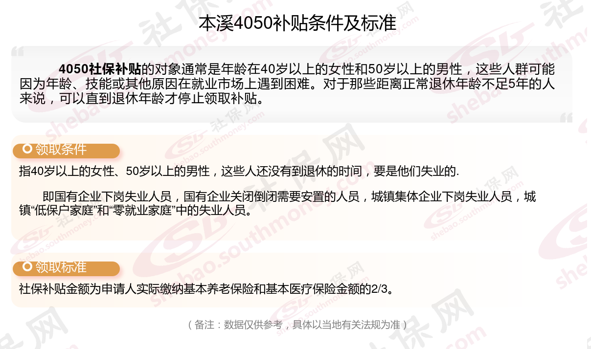 2024本溪4050补贴主要针对的是年龄在40岁以上的女性和50岁以上的男性,这些人群通常因为年龄较大而面临就业困难。