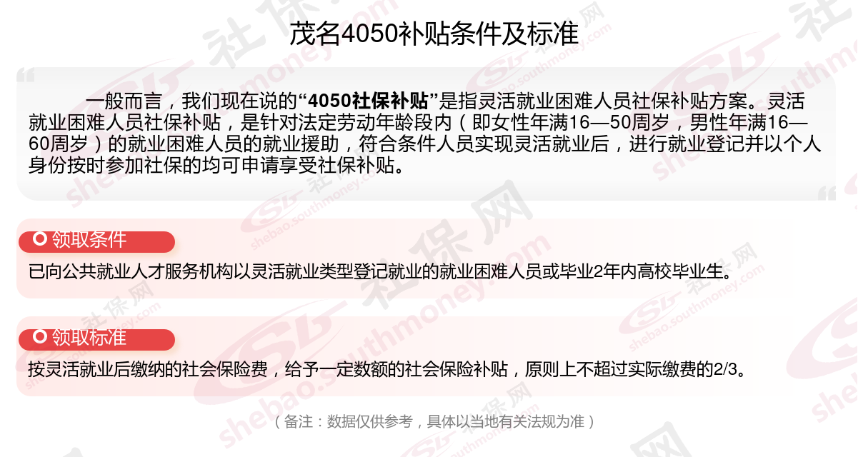 2024茂名灵活就业4050社保补贴是一项面向特定年龄段的就业困难人群的社会保险补贴。