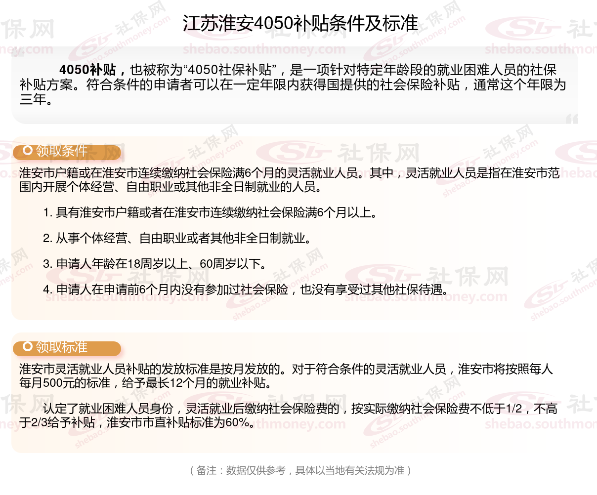 一、江苏淮安4050社保补贴标准及条件2023-2024年