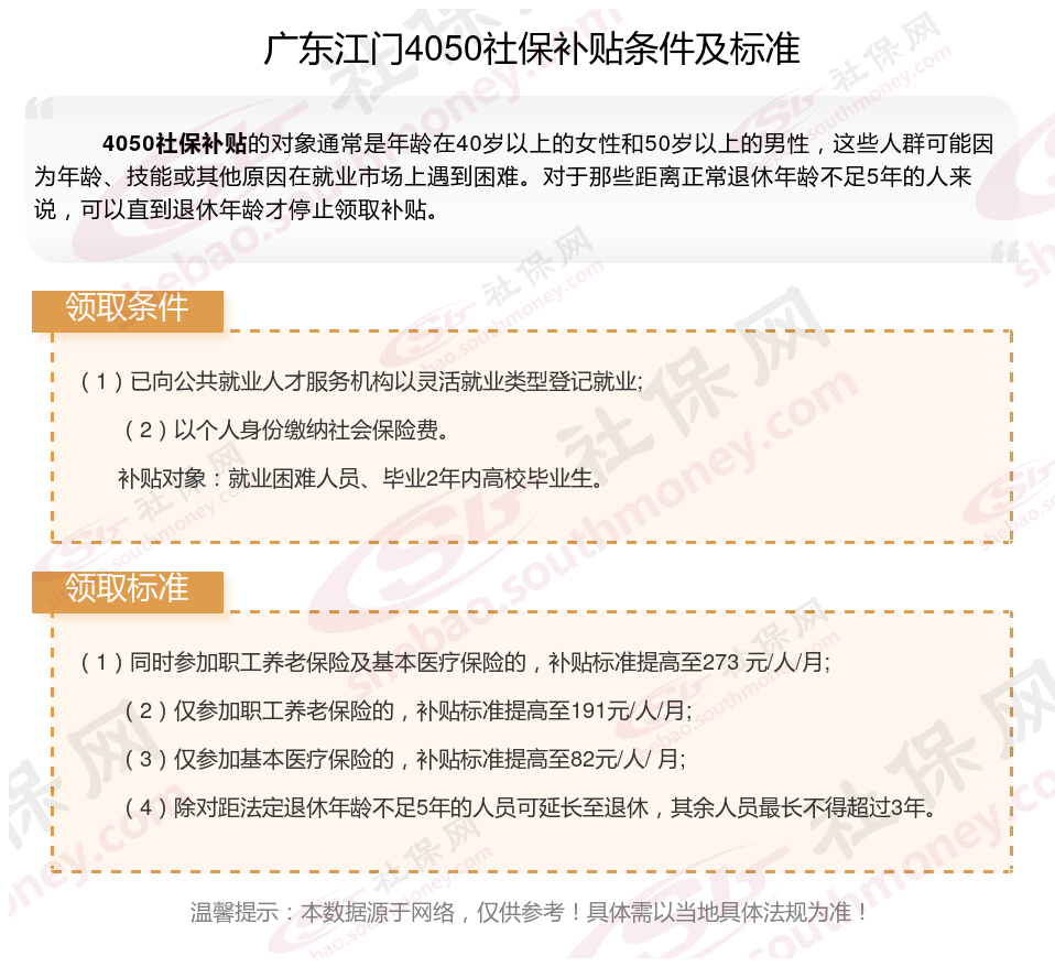 一、广东江门4050社保补贴标准及条件2023-2024年