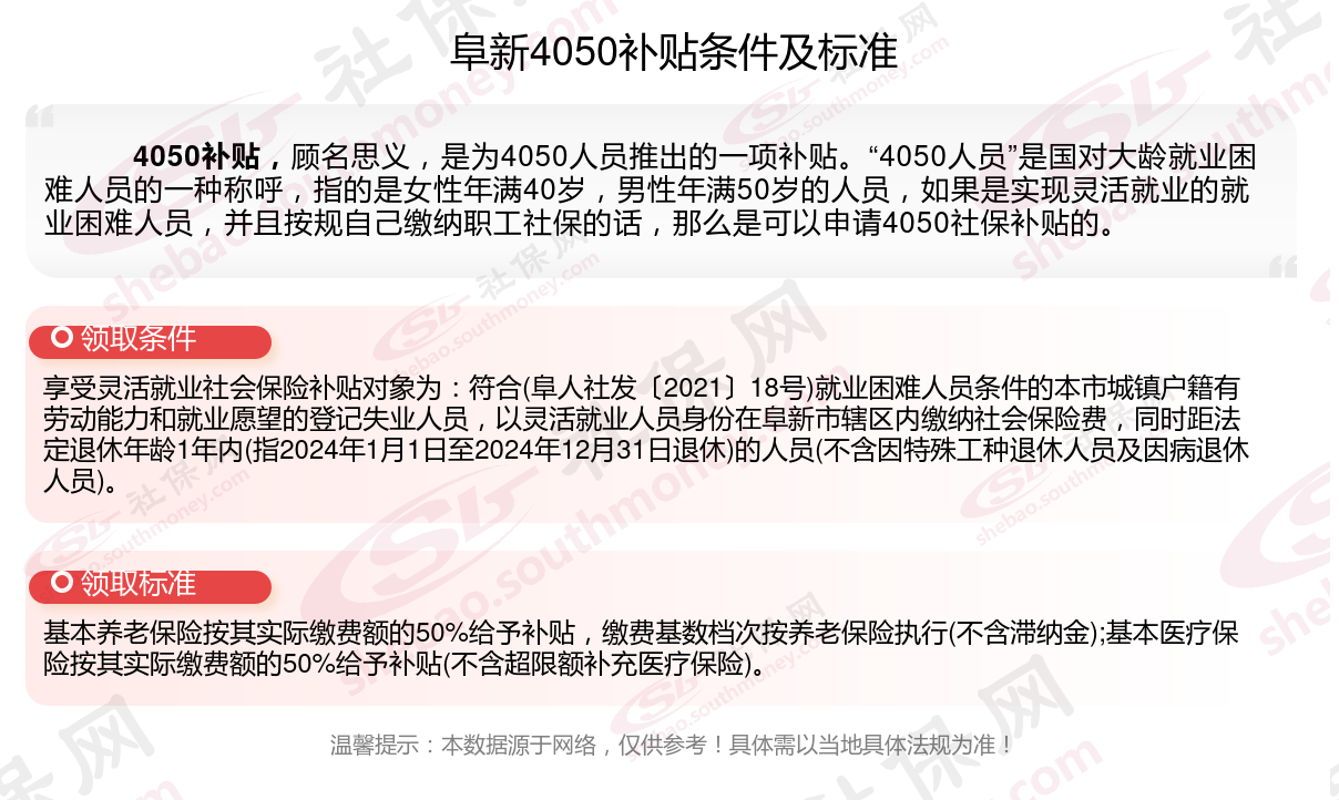 2024阜新灵活就业4050社保补贴是一项面向特定年龄段的就业困难人群的社会保险补贴。