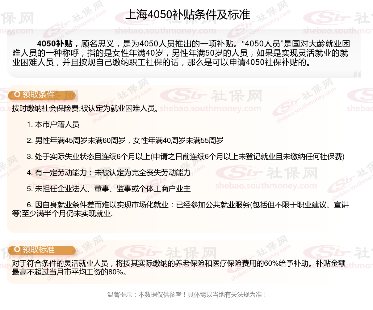 2024上海4050补贴主要针对的是年龄在40岁以上的女性和50岁以上的男性,这些人群通常因为年龄较大而面临就业困难。