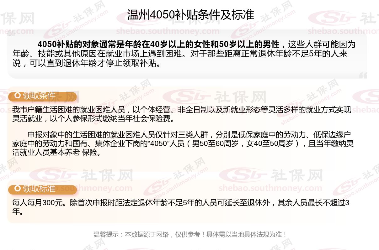 2024温州4050补贴主要针对的是年龄在40岁以上的女性和50岁以上的男性,这些人群通常因为年龄较大而面临就业困难。