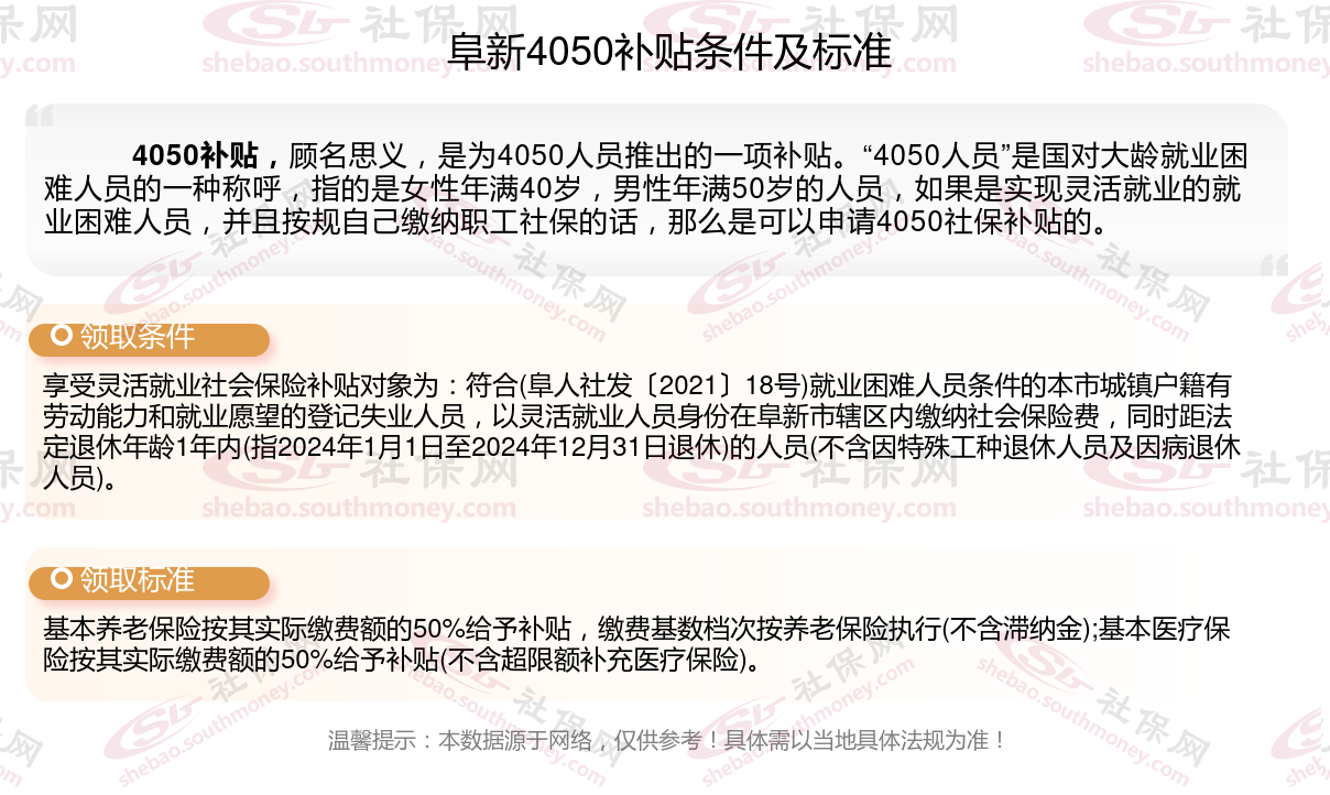 2024阜新灵活就业4050社保补贴是一项面向特定年龄段的就业困难人群的社会保险补贴。