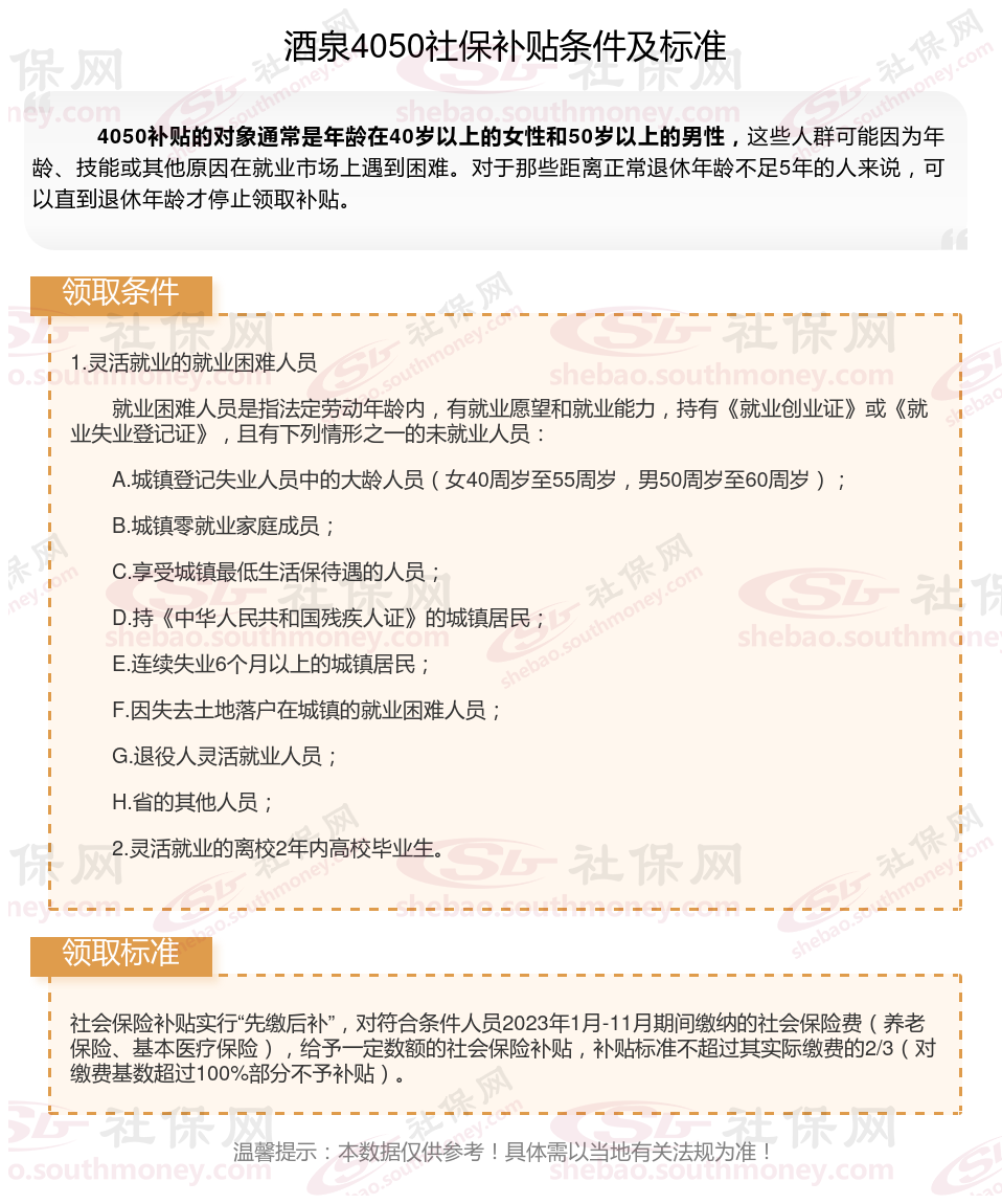 一、酒泉4050社保补贴标准及条件2023-2024年