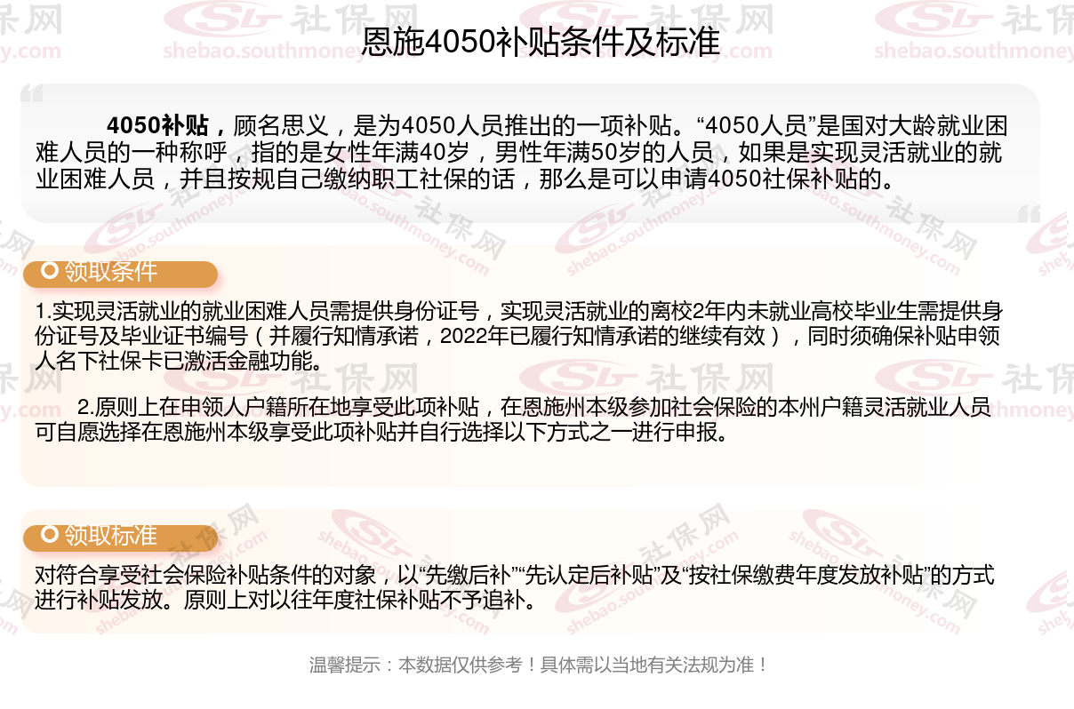 2024恩施4050补贴主要针对的是年龄在40岁以上的女性和50岁以上的男性,这些人群通常因为年龄较大而面临就业困难。
