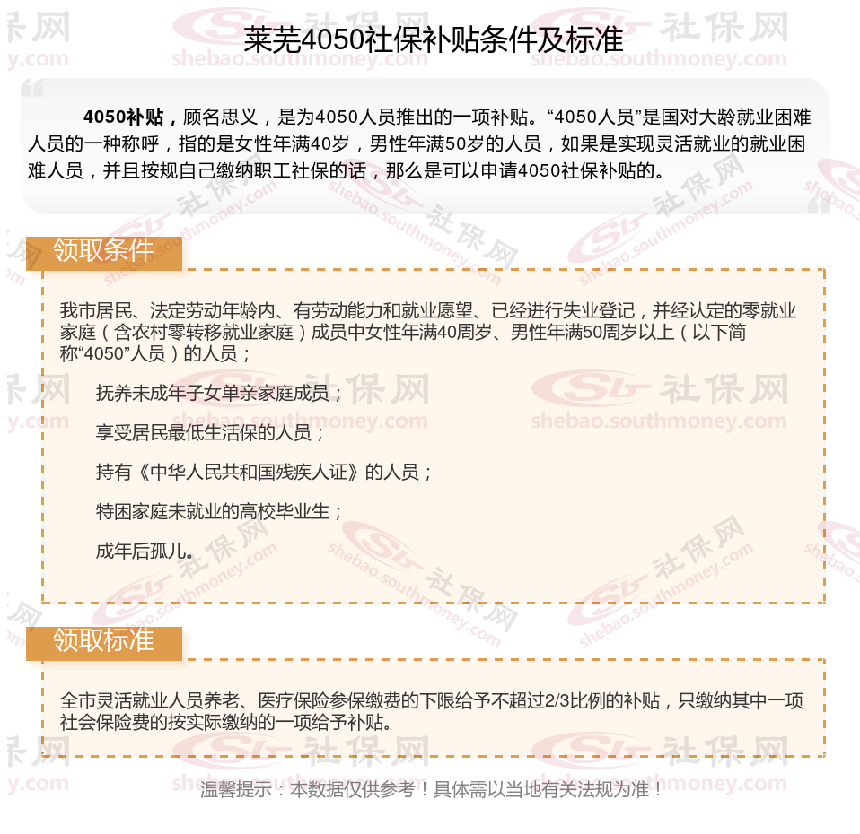 一、莱芜4050社保补贴标准及条件2023-2024年