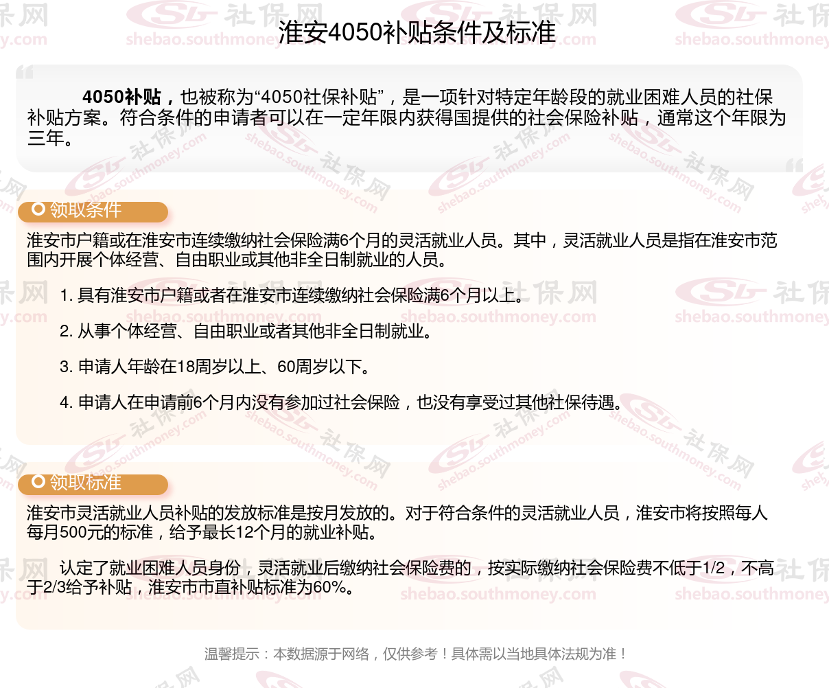 2024淮安灵活就业4050社保补贴是一项面向特定年龄段的就业困难人群的社会保险补贴。
