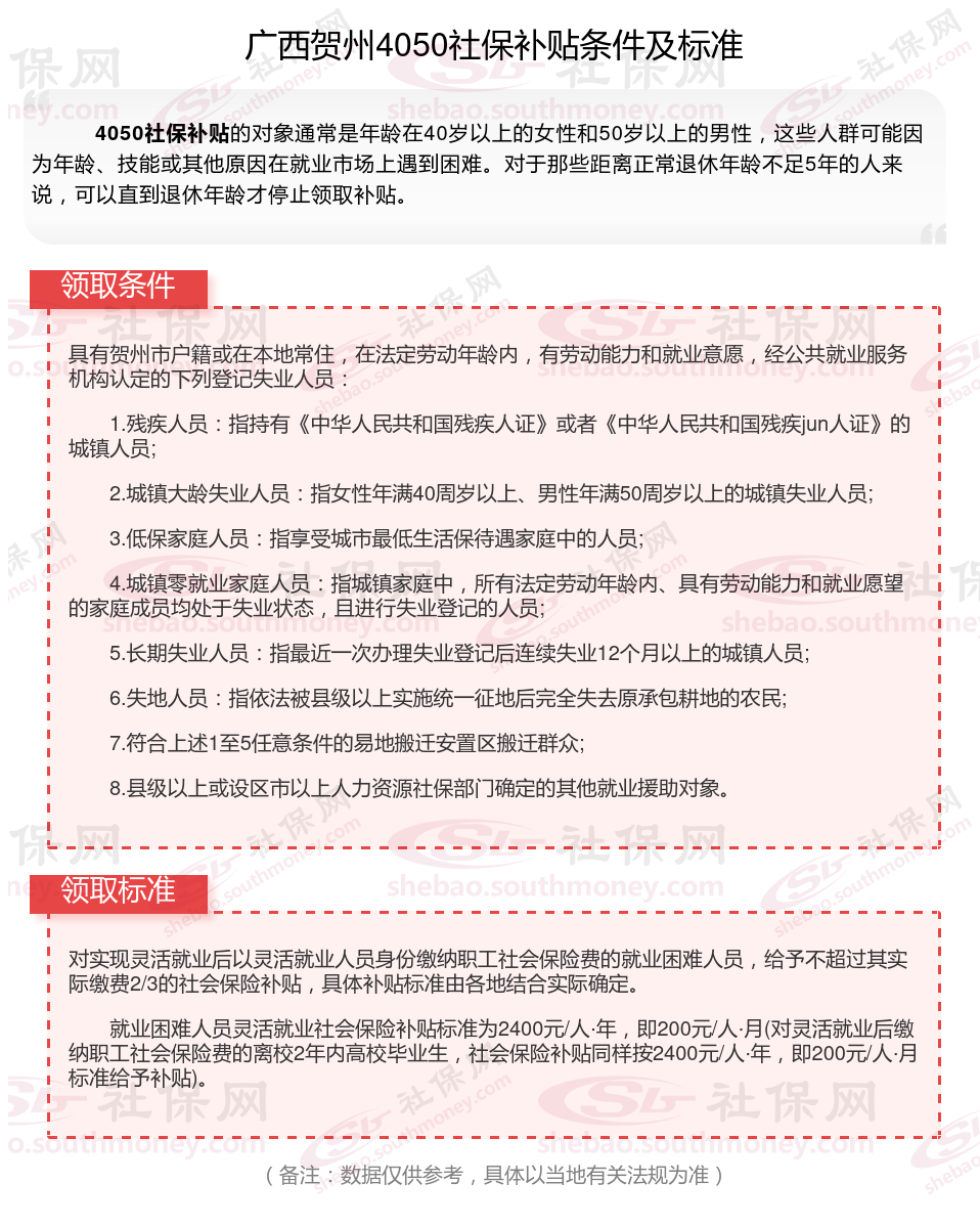 一、广西贺州4050社保补贴标准及条件2023-2024年