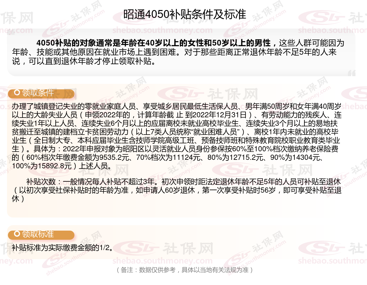 2024昭通灵活就业4050社保补贴是一项面向特定年龄段的就业困难人群的社会保险补贴。