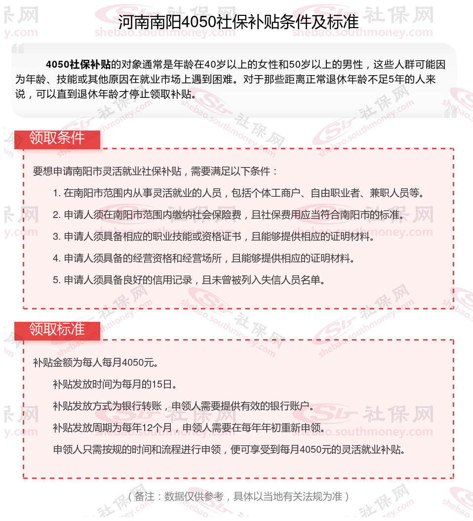 一、河南南阳4050社保补贴标准及条件2023-2024年