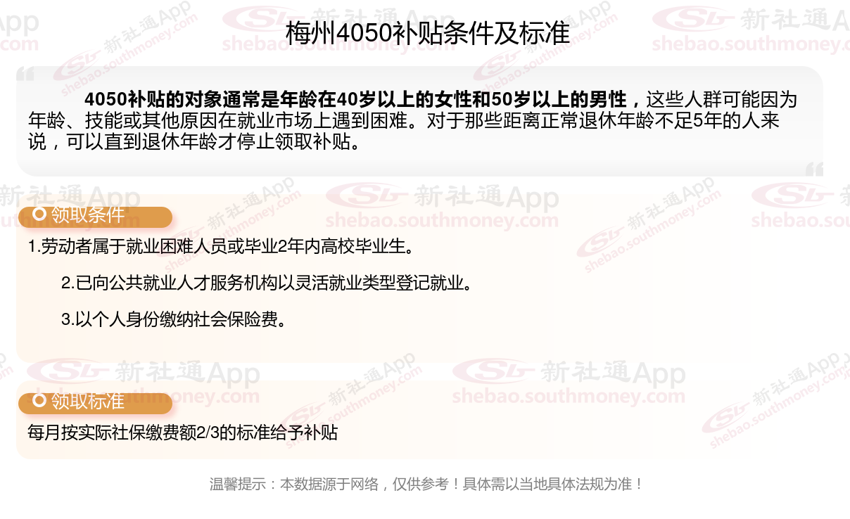 2024梅州灵活就业4050社保补贴是一项面向特定年龄段的就业困难人群的社会保险补贴。