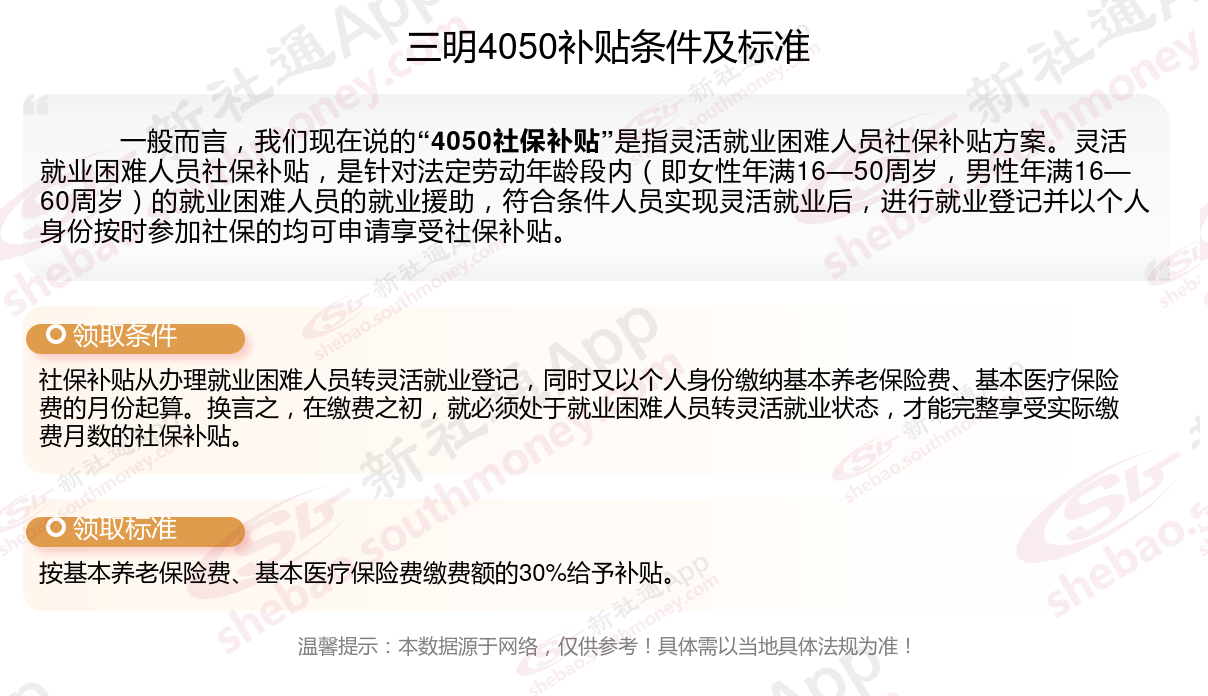 多数地区只有4050人员可以领取社保补贴,现在扩大了补贴对象及范围,通过就业困难人员认证,实现灵活就业,并且自己缴纳职工社保的灵活就业人员,一般都能申请灵活就业社保补贴。那么三明4050灵活就业社保补贴标准是多少钱?三明4050社保补贴条件是什么?接下来随新社通APP小编了解一下最新资讯。