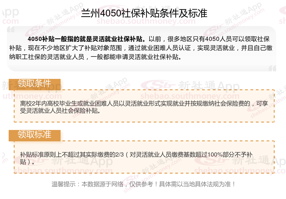 “4050人员”是国对大龄就业困难人员的一种称呼,指的是女性年满40岁,男性年满50岁的人员,那么兰州4050灵活就业社保补贴标准是多少钱?兰州4050社保补贴条件是什么?接下来随新社通APP小编了解一下最新资讯。
