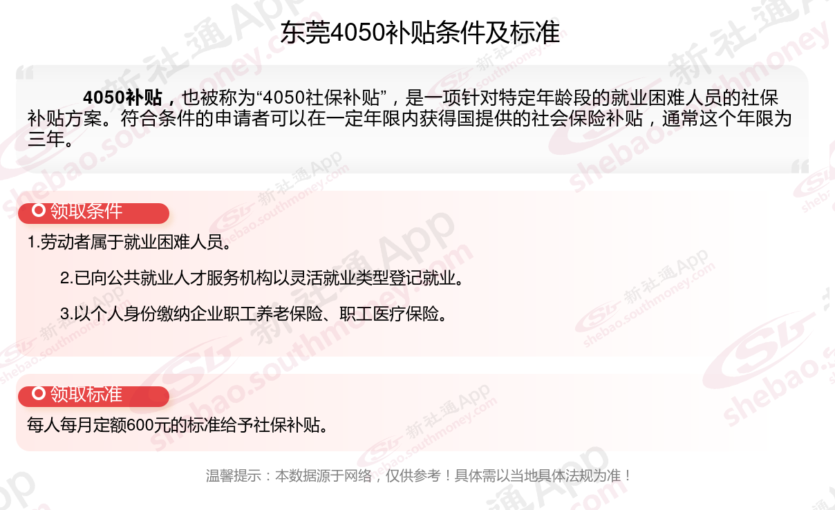 2024东莞4050补贴主要针对的是年龄在40岁以上的女性和50岁以上的男性,这些人群通常因为年龄较大而面临就业困难。