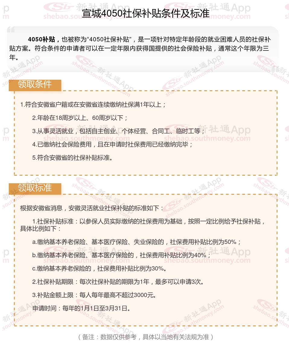 二、宣城4050社保补贴标准及条件2023-2024年,最新如下