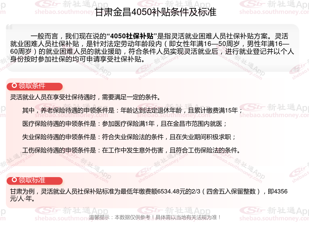 2024甘肃金昌灵活就业4050社保补贴是一项面向特定年龄段的就业困难人群的社会保险补贴。