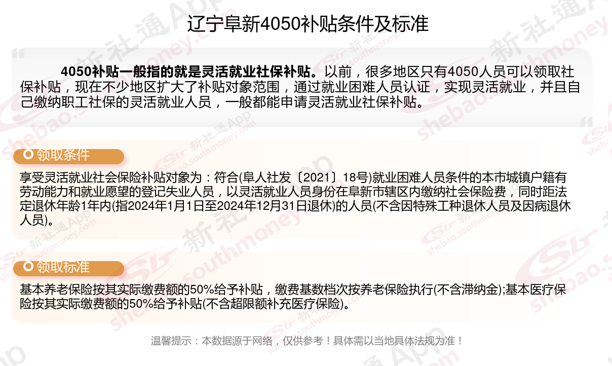 2024辽宁阜新灵活就业4050社保补贴是一项面向特定年龄段的就业困难人群的社会保险补贴。