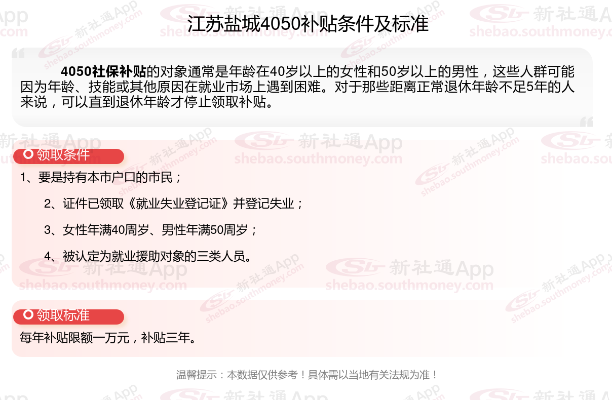 2024江苏盐城4050补贴主要针对的是年龄在40岁以上的女性和50岁以上的男性,这些人群通常因为年龄较大而面临就业困难。